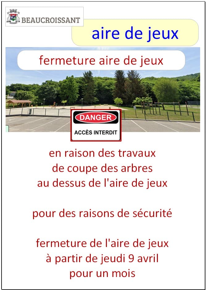 La fermeture de l’aire de jeux est malheureusement nécessaire en raison de travaux d’abattage d’arbres à proximité immédiate. Pour garantir la sécurité de tous, l’accès doit être temporairement interdit pendant ce chantier (risque de chute de branches ou d’arbres).